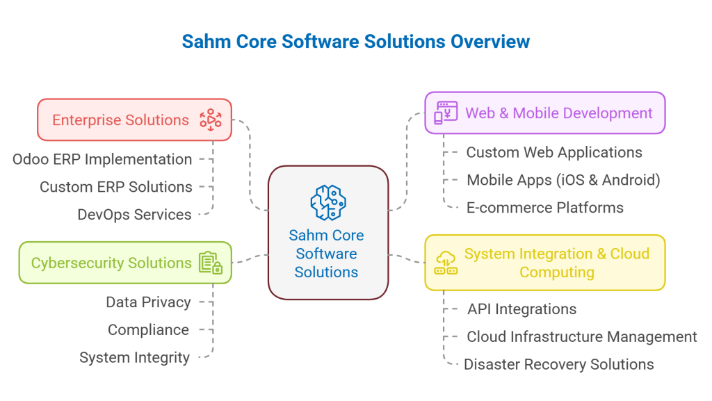 Our Software Solutions include Odoo ERP implementation, custom software development, web and mobile applications, system integration, cloud computing, and cybersecurity. We provide scalable and secure solutions to enhance business efficiency, automation, and digital transformation.