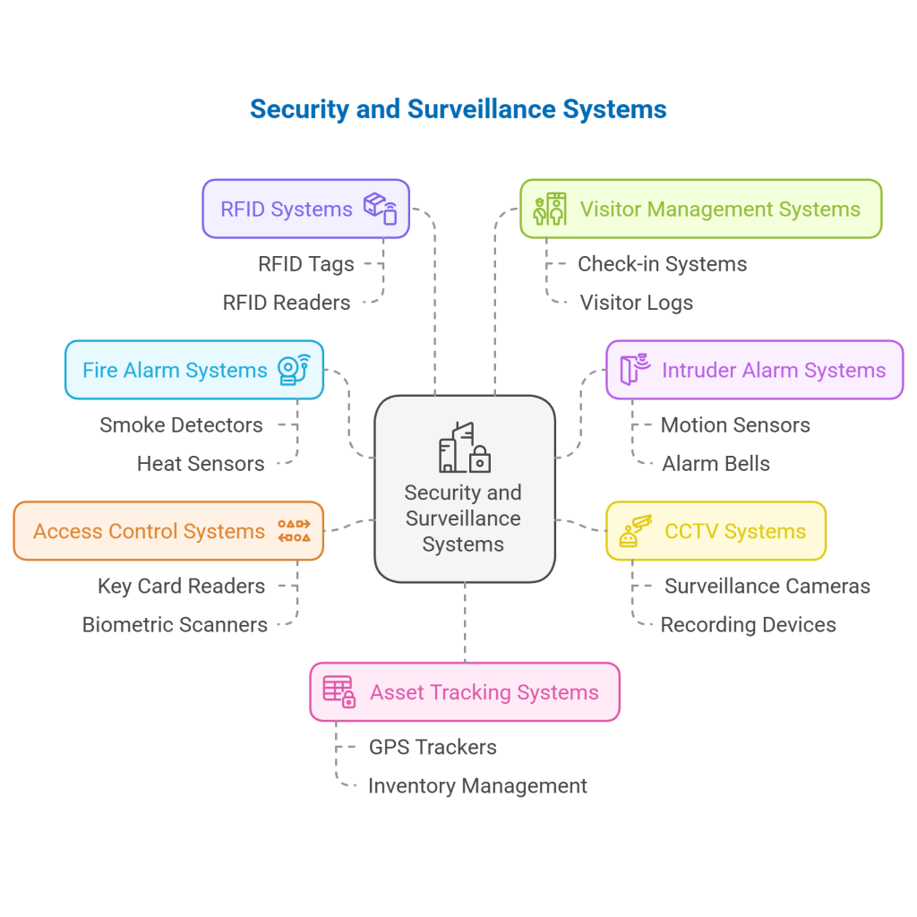 Systems that ensure the safety and security of buildings and their occupants by detecting and preventing unauthorized access, monitoring activities, and managing assets.