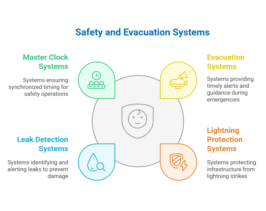 Systems, Safety and Evacuation Systems, and Power and Utility Systems, all designed to enhance safety, efficiency, and functionality in buildings.