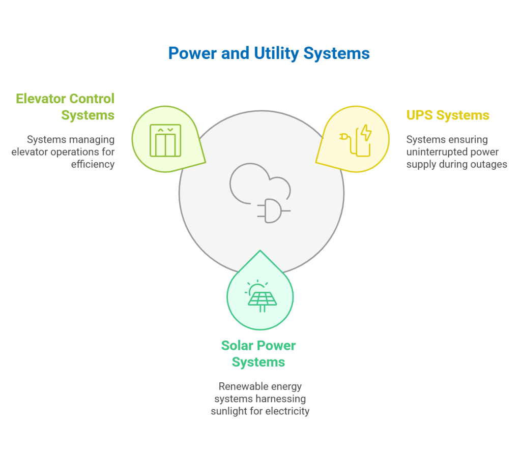 Systems that manage and provide reliable power supply and control essential utilities within buildings, ensuring uninterrupted operation and efficient resource utilization.
